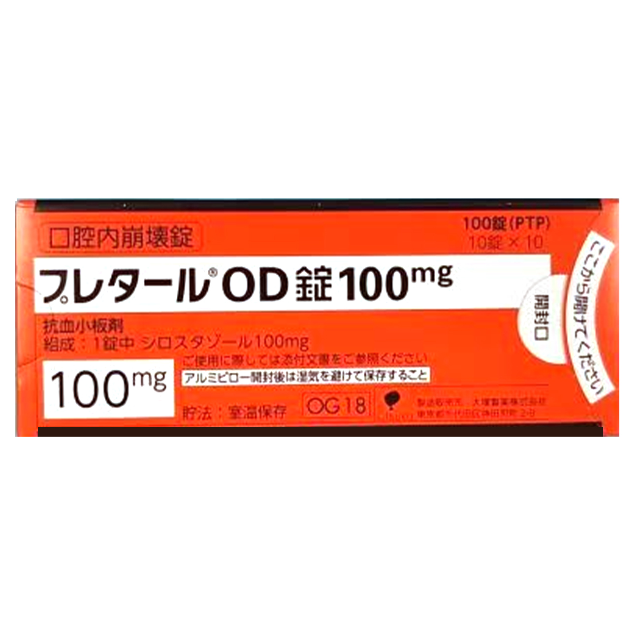 西洛他唑100mg片为白色片剂,直径约9.0mm,厚度约3.8mm,重量约250mg,刻有识别代码“OG18”。